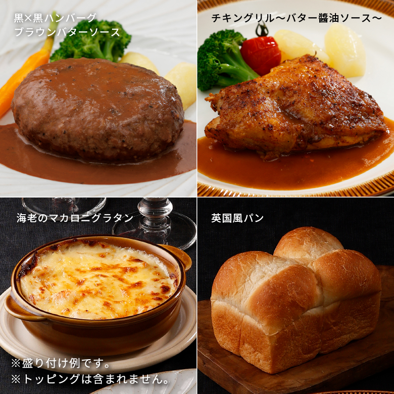 黒×黒ハンバーグ~ブラウンバターソース~(170g) × 1、チキングリル~バター醤油ソース~(150g) × 1、海老のマカロニグラタン(303g) × 1、英国風パン(137g) × 1 調理方法は個別に記載しています。