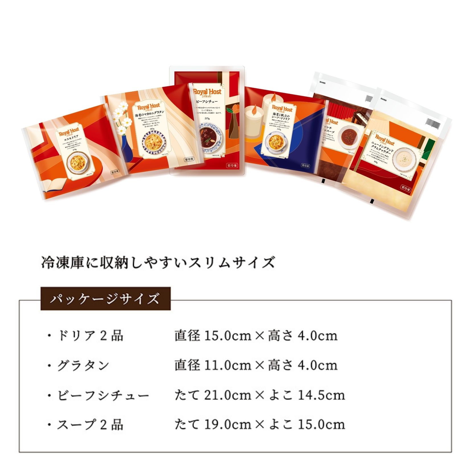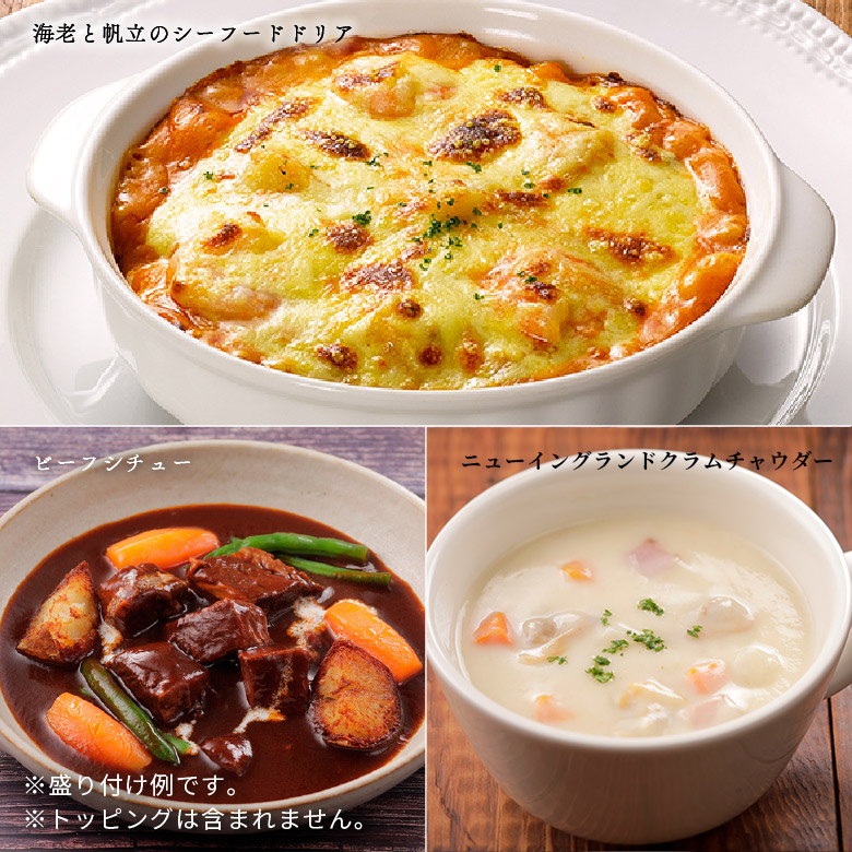 コスモドリア(370g) × 1、海老と帆立のシーフードドリア(345g) × 1、ビーフシチュー(215g) × 1、海老のマカロニグラタン(303g) × 1、ニューイングランドクラムチャウダー(160g) × 1、フレンチオニオンスープ(180g) × 1