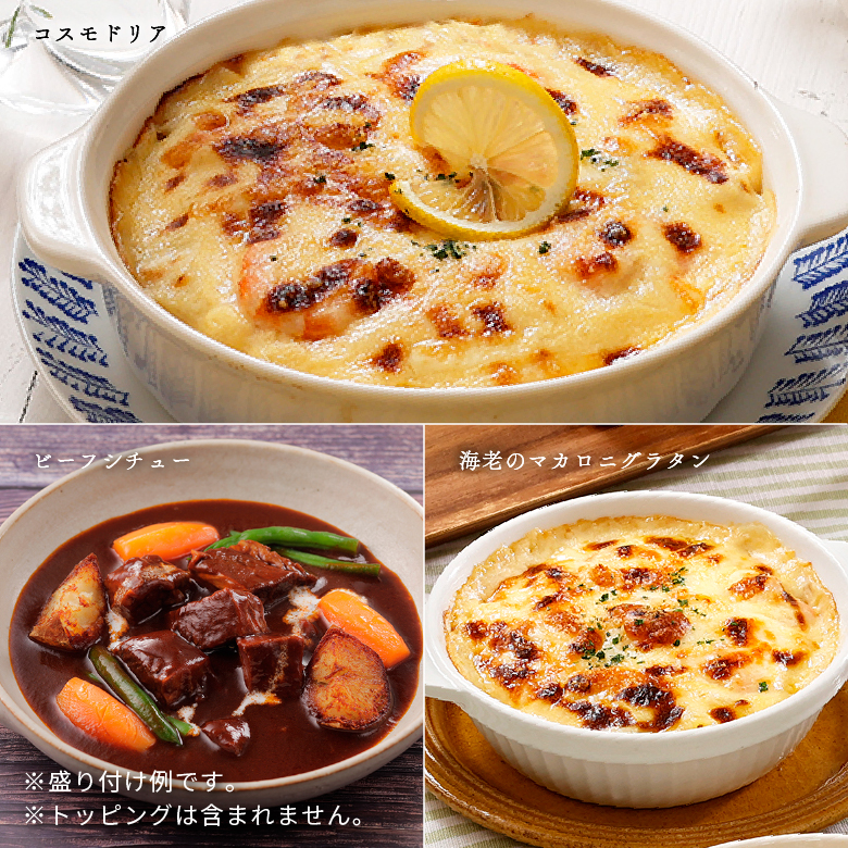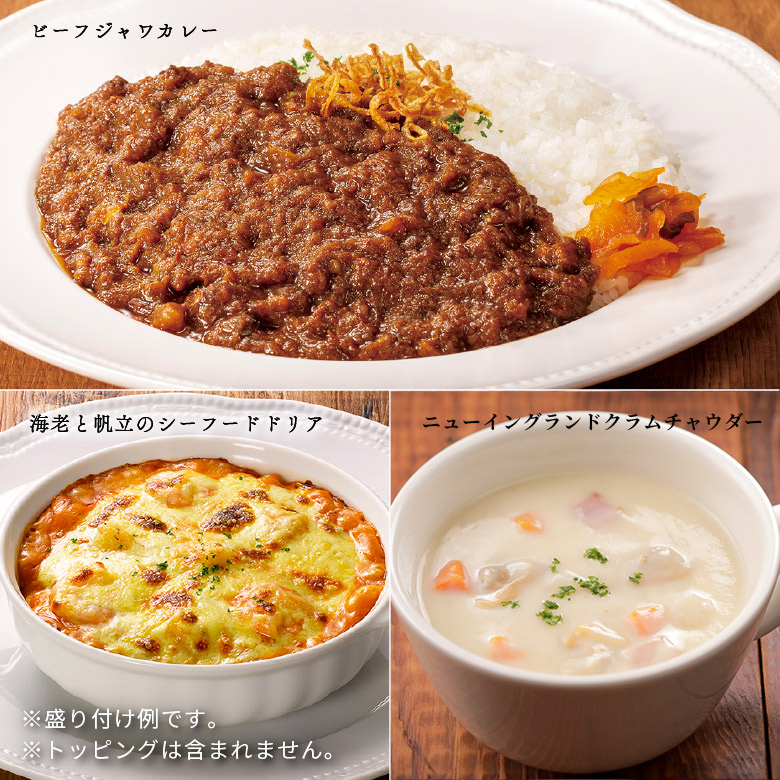 コスモドリア(370g) × 1、海老と帆立のシーフードドリア(345g) × 1、ビーフジャワカレー(160g) × 1 ニューイングランドクラムチャウダー(160g) × 2、ビーフシチュー(215) × 1、海老のマカロニグラタン(303) × 1