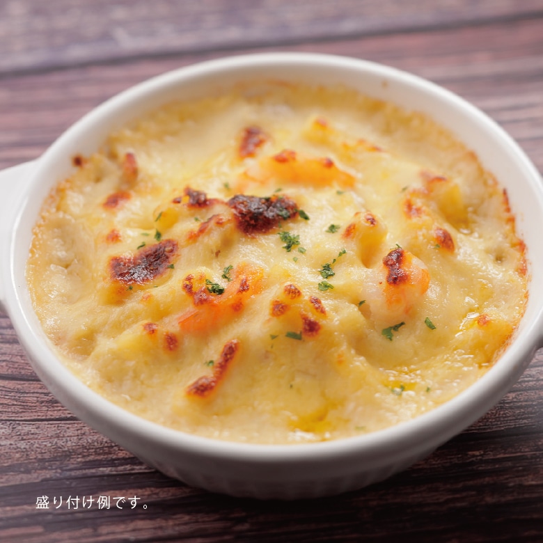 チキンのブイヨンと玉ねぎの甘みが引き立つ濃厚なホワイトソースをマカロニに合わせ、海老とチーズをのせてこんがり焼き上げました。