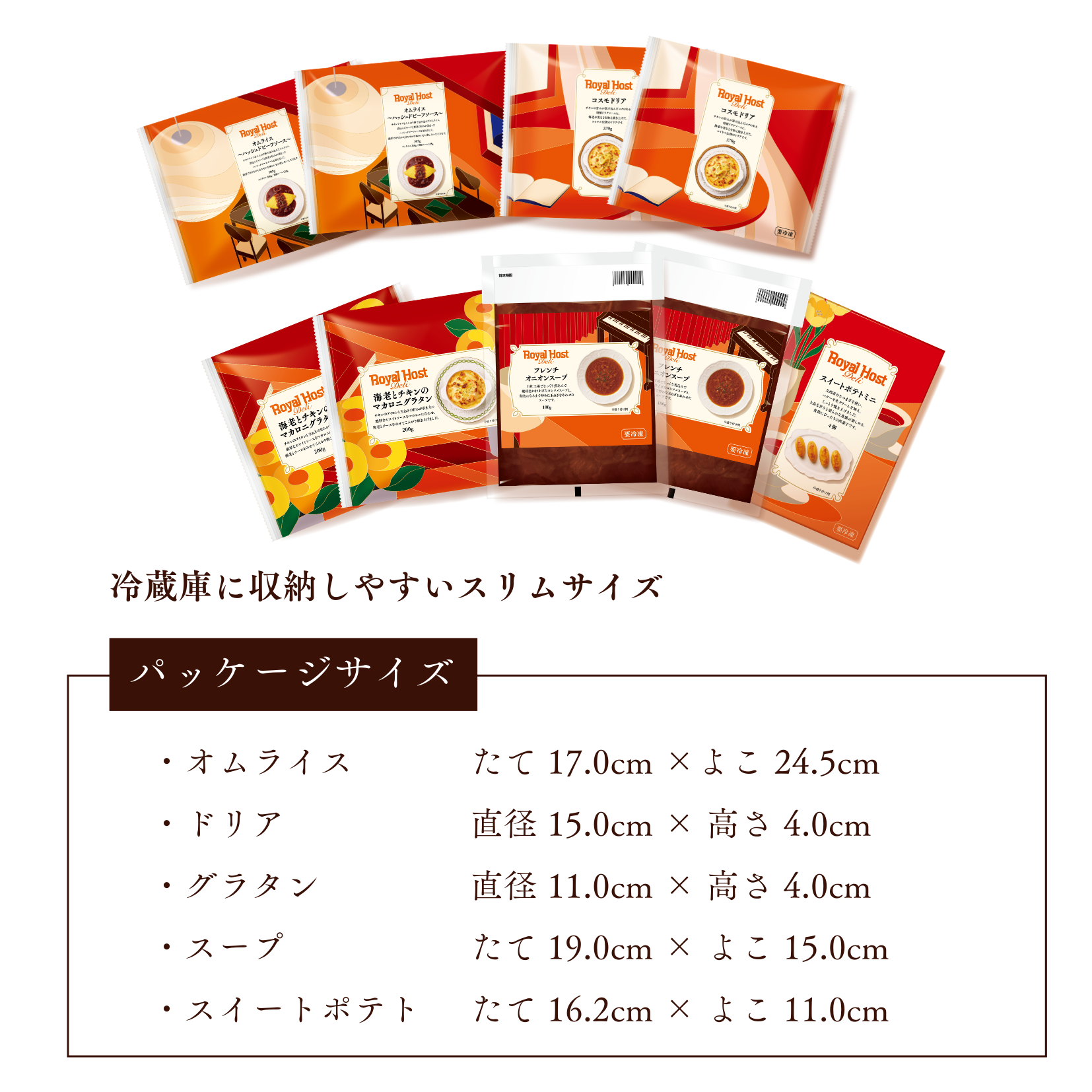 フレンチオニオンスープ(180g)× 2、オムライス~ハッシュドビーフソース~(385g)×2、コスモドリア(370g)× 2、海老とチキンのマカロニグラタン(200g)× 2、スイートポテトミニ(4個入り)× 1