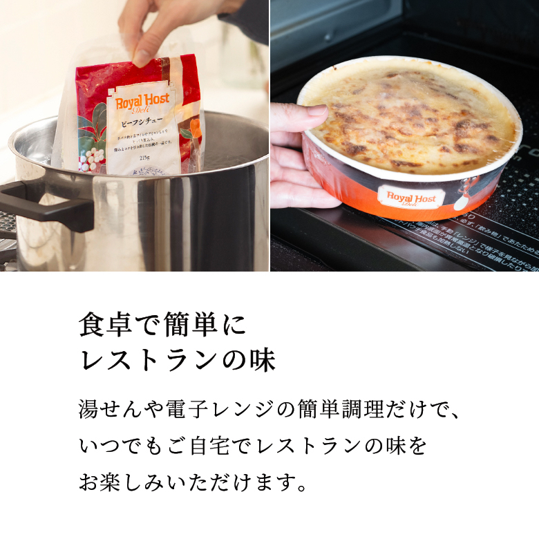 コスモドリアや海老とチキンのマカロニグラタン、オムライスなど、温めるだけでレストランの味わいをご家庭で楽しめるメニューを詰め合わせました。