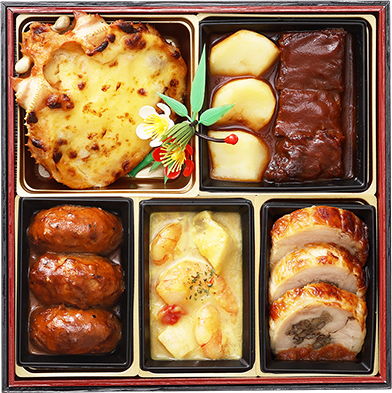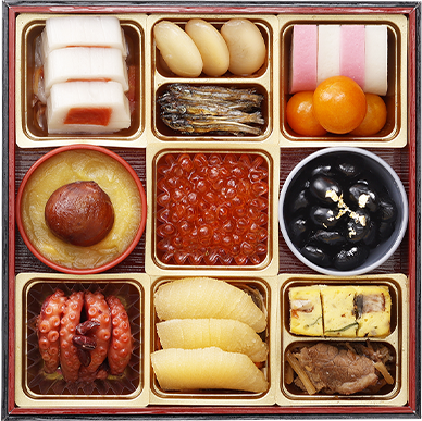 金目鯛西京焼や海老、あわび旨煮などの縁起の良い食材を盛り込んだ料理で、新年の食卓を華やかに彩ります。